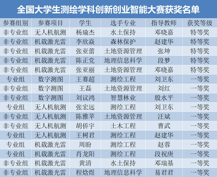 本届赛事是《全国普通高校大学生竞赛分析报告》竞赛目录,是全国大学生展示测绘科技创新的最高级别赛事,自本年度4月份启动以来,在学校本科生院、创新创业学院的支持与指导下,低空经济学院认真组织校赛、省赛,选派指导教师团队,选拔了35名学生参赛,经过近4个月的赛前辅导,有效提升了参赛学生的专业理论与实践水平。竞赛过程中,参赛学生凭借扎实的专业素养、精湛的实操技能以及严谨的科学态度勇创佳绩,充分彰显了中南林学子敢于拼搏的精神风貌。(一审/杨家伟 二审/张胜利 三审/周预分)