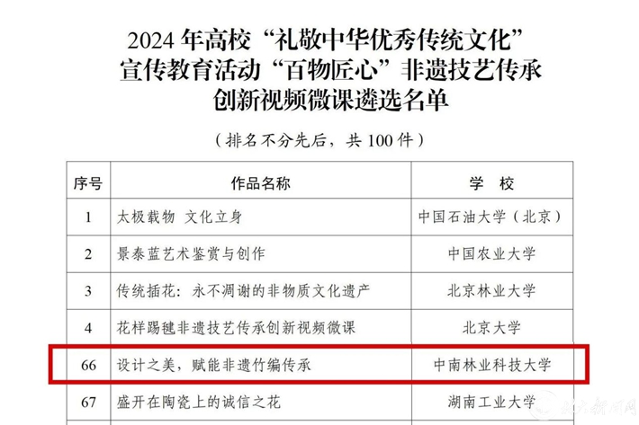 【林大网讯】(文/家居与艺术设计学院)近日,教育部公布2024年高校“礼敬中华优秀传统文化”宣传教育活动评选结果,我校家居与艺术设计学院张广酃、邓莉文老师指导的《设计之美,赋能非遗竹编传承》视频微课入围优秀作品。