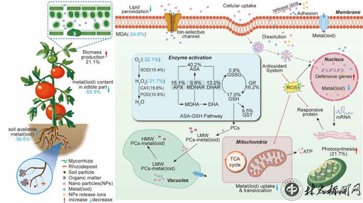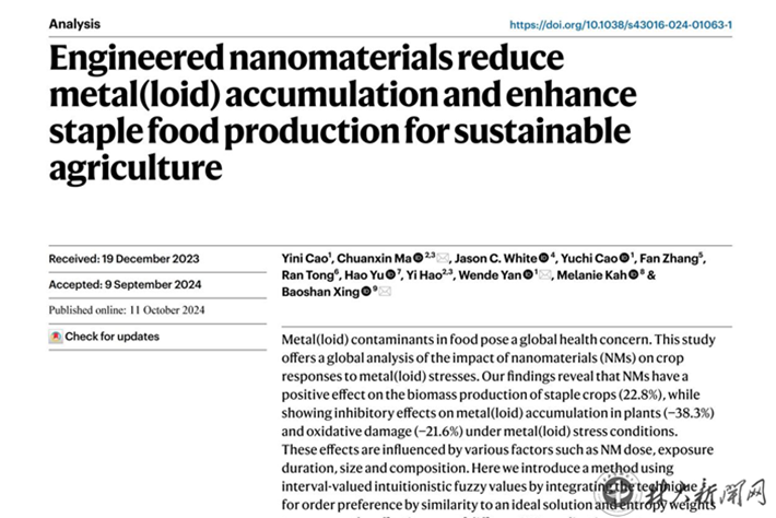 【林大网讯】(文/南方林业生态应用技术国家工程实验室)10月11日,中南林业科技大学南方林业生态应用技术国家工程实验室闫文德教授修复生态学团队与美国马萨诸塞大学Baoshan Xing教授、广东工业大学马传鑫教授等共同在Nature子刊Nature Food (IF=23.6)上发表题为《Engineered nanomaterials reduce metal(loid) accumulation and enhance staple food production for sustainable agriculture》的研究论文,揭示了纳米材料可有效降低土壤重金属污染并提升作物产量,该研究结果为区域生态环境安全和农业可持续发展提供了新见解。