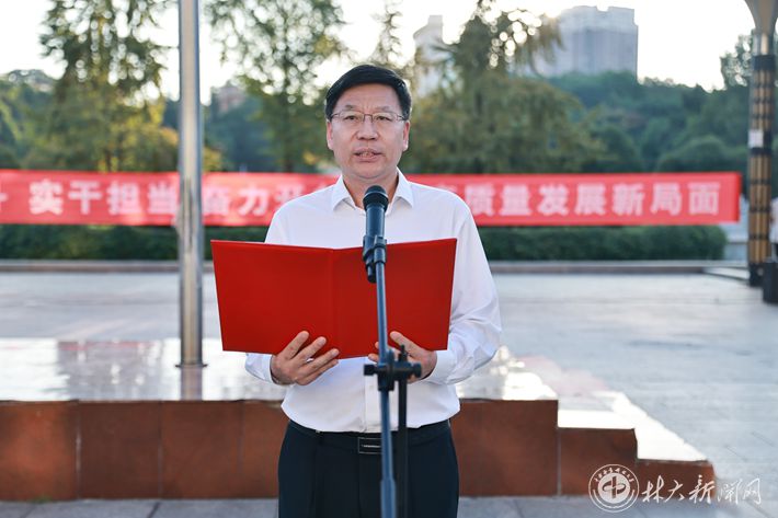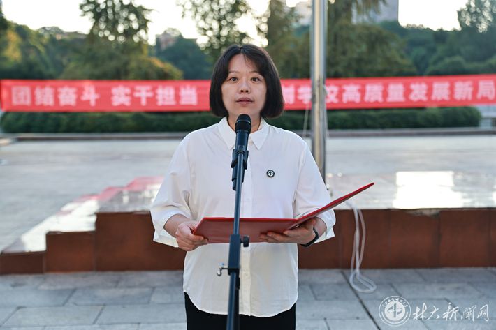 中国工程院院士、校党委书记吴义强发表国旗下的讲话。他表示,75年来,新中国从一穷二白到全面小康,实现了从站起来、富起来到强起来的伟大飞跃。中国人民在中国共产党的坚强领导下,以百折不挠的奋斗精神,书写了人类发展史上的壮丽篇章,这不仅是中华民族的伟大胜利,也是世界文明史上的璀璨一页。他寄语广大青年学子,要继承和发扬“求是求新、树木树人”的校训精神,赓续红色血脉,厚植家国情怀,树立远大理想,勇于担当作为,不断追求卓越,用青春和汗水,续写属于中南林人的崭新篇章。
