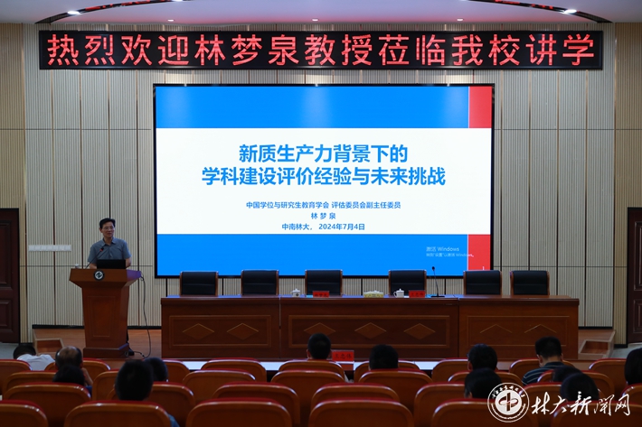 【林大网讯】(文/学科建设与发展规划处 何玉琴)7月4日下午,我校邀请教育部学位与研究生教育发展中心原副主任林梦泉教授在林学院报告厅作题为“新质生产力背景下的学科建设评价经验与未来挑战”的专题报告。学科处、研究生院、科研院、人事处负责人,各学院院长、分管学科建设与研究生教育的副院长、学科带头人、专业学位类别(领域)负责人、学科骨干、学科秘书等参会。会议由学校党委副书记王忠伟主持。