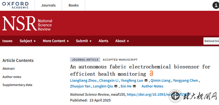 【林大网讯】(文/电子信息与物理学院)近日,我校电子信息与物理学院罗勇锋教授团队在柔性电子与生物传感领域取得突破性进展,成功构建“集成自主刺激的织物电化学生物传感器系统”,实现低电流驱动下高效汗液诱导与多生物标志物连续监测的技术突破。相关研究成果以《一种用于高效健康监测的自主式织物电化学生物传感器》(An autonomous fabric electrochemical biosensor for efficient health monitoring)为题,发表于《National Science Review》(国家科学评论,NSR,中科院1区Top,最新影响因子为16.3,5年影响因子为18.6)。