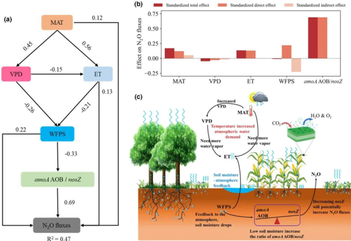 作者利用原位研究结合网格化和遥感数据分析全球N2O通量排放。研究了温度、水文气候对全球N2O通量的协同效应,即土壤湿度-大气反馈对N通量的影响。本研究结果表明大气需水量随温度的增加会降低土壤含水量,在土壤含水量较低的条件下,产生N2O的硝化菌(含有amoA AOB基因)增加,而消耗N2O的反硝化菌(含有nosZ基因)减少。本研究加深了对土壤水分-大气相互作用对土壤氮循环影响的理解,优化了N2O排放的地球系统模型。