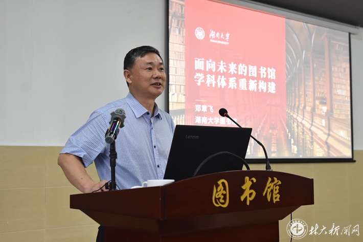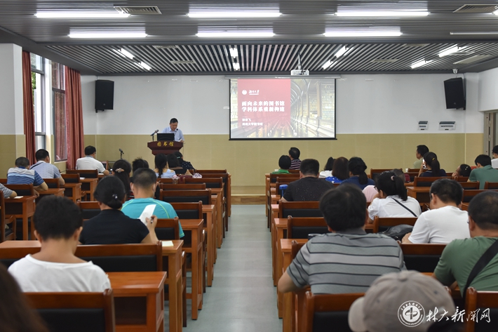 【林大网讯】(文/图书馆 吴旭艳)7月8日下午,湖南省高校图书情报工作委员会秘书长、湖南大学图书馆原馆长郑章飞教授在我校图书馆西馆会议室作了题为“面向未来的图书馆学科体系重新构建”的学术讲座。讲座由图书馆馆长李本贵主持,图书馆全体职工参加。