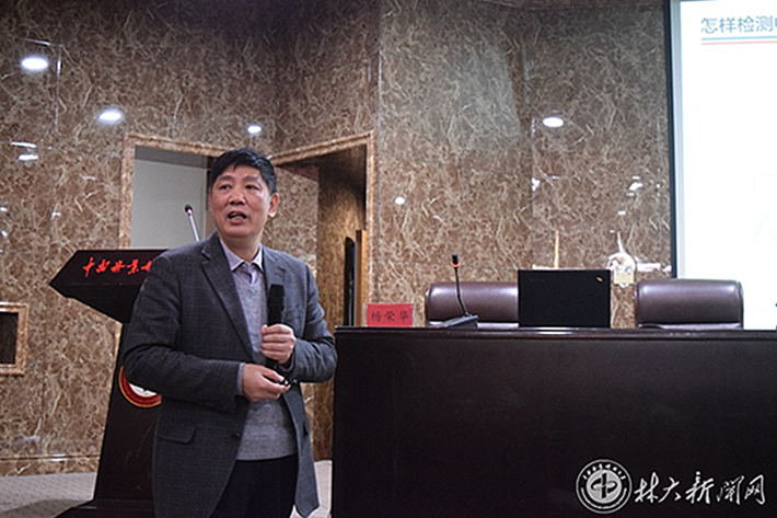 【林大网讯】(文/生命科学与技术学院)11月29日上午,“长江学者”特聘教授、“国家杰出青年科学基金”获得者杨荣华教授应邀来我校讲学,在图书馆报告厅作了题为“怎样拓展研究思路”的讲座。生科院、林学院、食品院、材料院等多个学院的师生参与讲座,生命科学与技术学院院长闫文德主持此次讲座。
