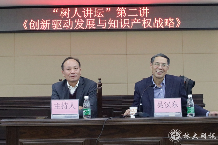 【林大网讯】(文/政法学院)11月21日晚,我国著名知识产权专家,中南财经政法大学原校长吴汉东教授应邀在学校“树人讲坛”作了题为“创新驱动发展与知识产权战略”的学术讲座。讲座由政法学院院长王飞跃教授主持,我校师生、省内其他高校师生以及法官、律师等人一起聆听了讲座。