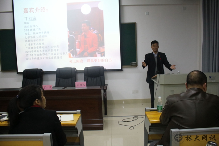 【林大网讯】(文/政法学院 伍振军)12月5日晚,湘鄂赣“最美读书人”、湖南广通发展教育咨询有限公司总经理、国家二级心理咨询师丁红波应邀在文科楼进行了“爱上阅读,遇见更好的自己”主题讲座,政法学院100多名师生聆听讲座。政法学院辅导员梁旭主持。