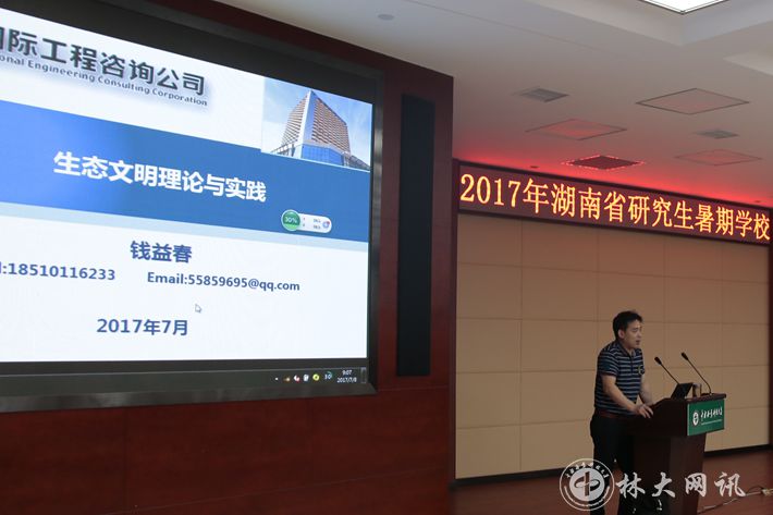 【林大网讯】(文/风景园林学院 张旻桓)7月8日上午,中国国际工程咨询公司钱益春博士应邀在文科楼报告厅为2017年湖南省“生态文明建设与风景园林”研究生暑期学校的学员们作了题为“生态文明理论与实践”的学术报告。