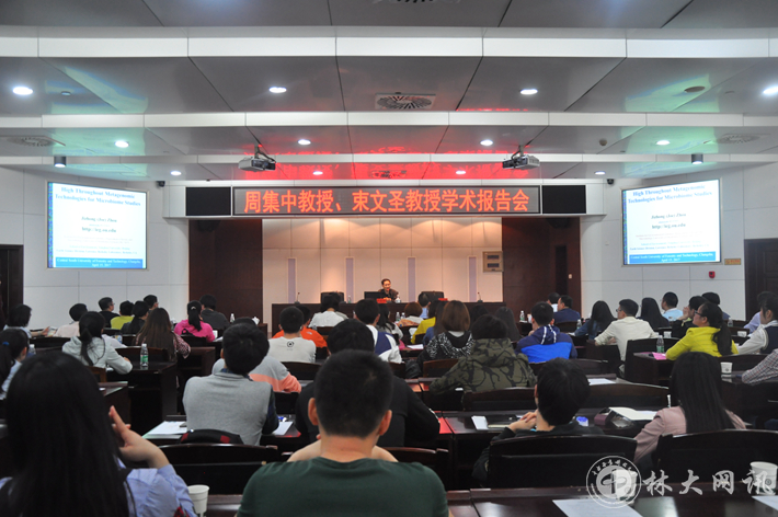 周集中做了题为“High Throughout Metagenomic Technologies for Microbiome Studies”的学术报告。报告以高通量测序及其在微生物学广泛应用的背景展开,介绍了针对高通量测序中存在的一些问题,而开发的用于生物地球化学、生态学和环境科学中的微生物群落功能结构研究综合性基因芯片(GeoChip),最后介绍了GeoChip在微生物学研究上的成果。