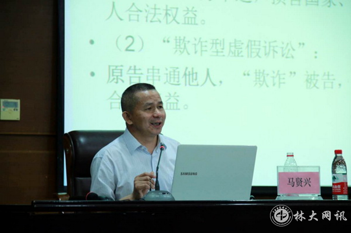 【林大网讯】 5月31日,政法学院邀请长沙市天心区人民法院党组书记、院长马贤兴在图书馆报告厅以《虚假诉讼的防治与民间借贷的规范》为题为我校法学专业师生做了学术讲座。讲座由政法学院院长周训芳主持。学校社会科学处处长蒋兰香、法学专业负责人雷鑫以及法学专业100多位师生参加。