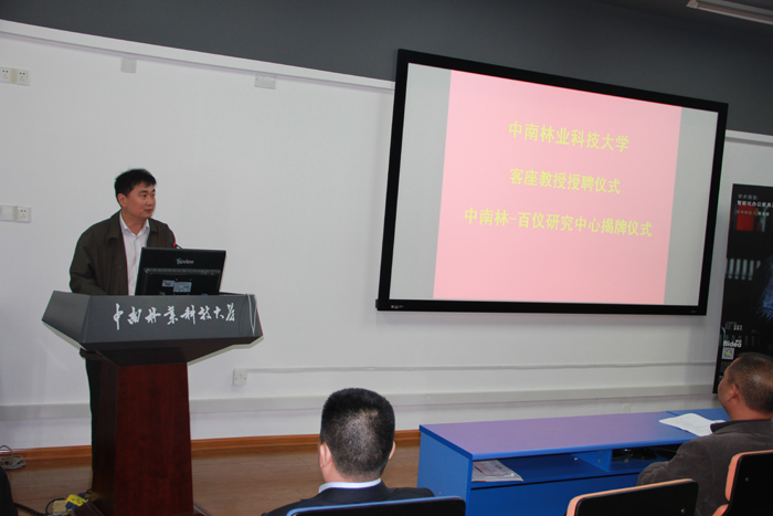 受聘仪式结束后,在学院二楼研究中心举行了中南林-百仪研究中心揭牌仪式。张友吉董事长与刘文金院长共同签署了研究中心科研合作协议。