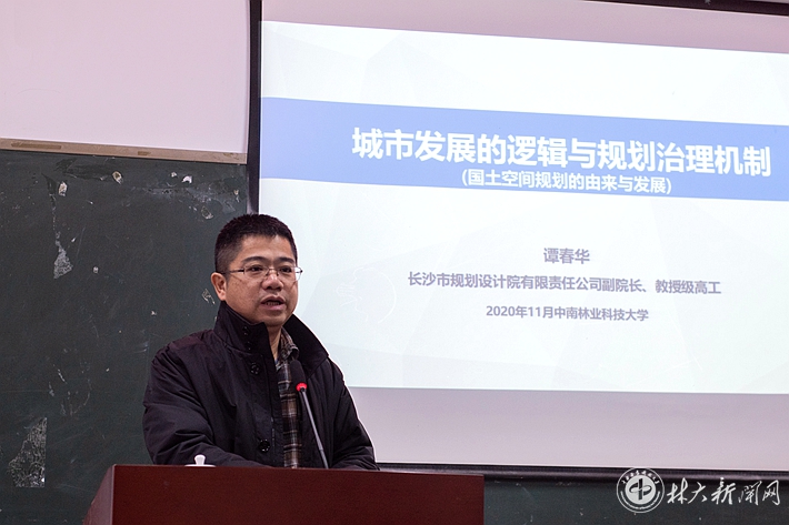 【林大网讯】(文/风景园林学院) 1128日上午,湖南省风景园林学会副理事长、长沙市城市规划学会副理事长、长沙市城市规划设计院副院长谭春华教授在致美楼作了题为“城市发展的逻辑与规划治理机制探讨”的学术讲座,风景园林学院师生70余师生参加聆听。本次讲坛由城乡规划系系主任陈存友副教授主持。