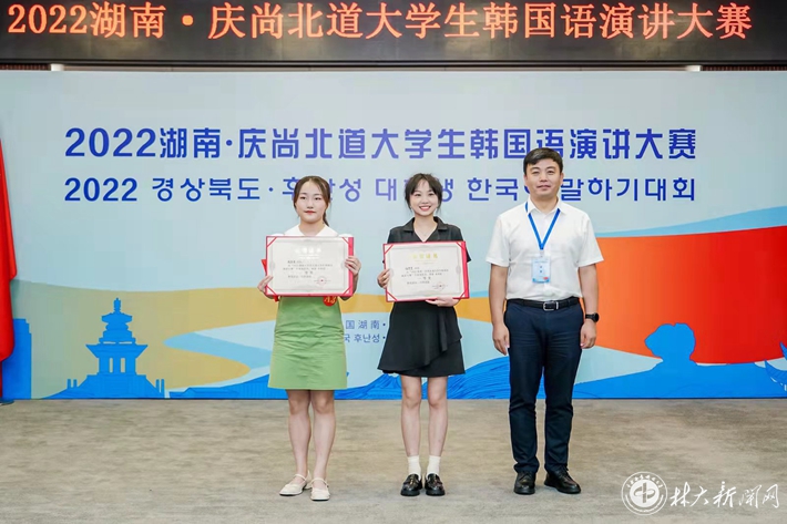 【林大网讯】(文/外国语学院 周禧玲)6月10日上午,“2022湖南•庆尚北道大学生韩国语演讲大赛”在我校博文楼立德厅举行。湖南省人民政府外事办公室副主任杨琦,学校副校长仇怡,湖南师范大学东北亚研究中心主任蔡美花,韩国庆尚北道驻湘交流员朴常铁,韩国龟尾市中国贸易合作代表处所长施炳渊,大韩贸易投资振兴公社长沙贸易馆馆长金昊俊等嘉宾出席本次大赛。