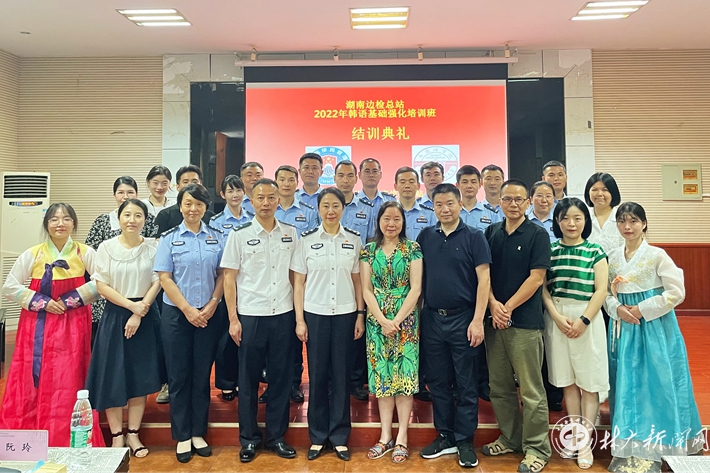 【林大网讯】(文/外国语学院 周禧玲)7月25日上午,由湖南边检总站主办、我校外国语学院承办的“湖南边检总站2022年韩语基础强化班”结训典礼在学校举行。