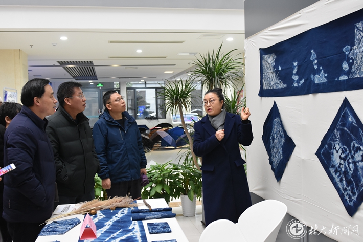 在展览现场,家具与艺术设计学院的唐立华教授介绍,蓝染作为一种古老的印染工艺,在中国已传承千年,具有回归自然生态的绿色环保理念。学院以生态设计理念为导向,开设了《手工染织设计与实践》等相关课程,通过对民间艺术进行系统教学,启发学生以创新的手法,将中国传统艺术应用于现代生活空间,提高了学生的绿色发展意识和绿色创新能力。本次展览也是对学院课程教学改革与艺术教学成果的一次检阅。(图/吴旭艳 编辑/陈名虎)