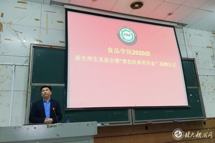 【林大网讯】(文/食品学院 刘宇)10月10日晚,食品学院在生科楼001教室举行学院2020级新生师生见面会暨“黑色经典奖学金”捐赠仪式。长沙伍爱美食食品科技有限公司CEO、黑色经典创始人卢路成先生、长沙有知教育董事长刘杰先生、学院班子、教职工代表以及2020级全体本科生、研究生参加了此次见面会。会议由学院党委书记李婷主持。