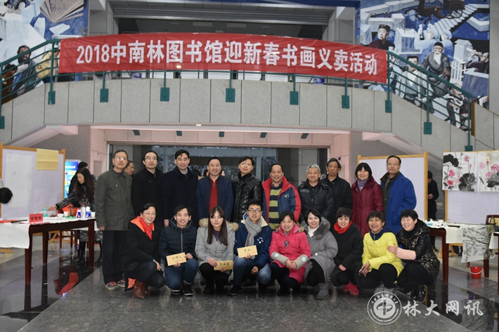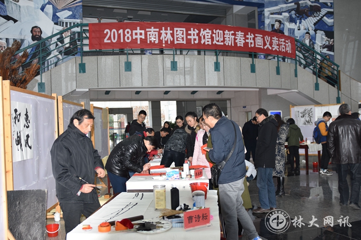 【林大网讯】(文/图书馆霍媛桃)1月5日下午,为了给我校三位贫困大学生捐助回家过年的路费,图书馆联合校党委宣传部、团委、学工部举办2018年迎新春书画义卖笔会。参加此次活动的有我校教职工以及退休老同志等。图书馆书法协会的老师和书友同盟协会的同学也给予了大力支持。