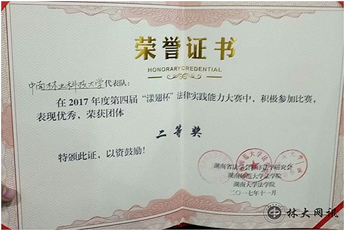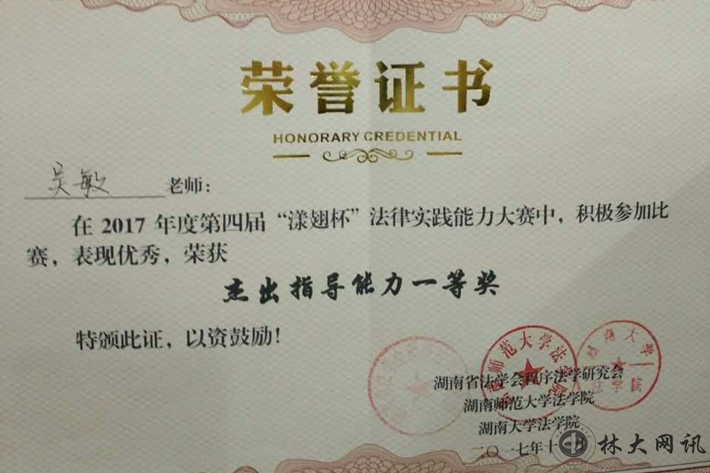 【林大网讯】(文/政法学院 曾晓峰)11月26日,2017年第四届“漾翅杯”法律实践能力大赛在湖大和湖师大落幕。经过激烈的赛场角逐,我校政法学院2016级法学本科生代表队,获得了团体二等奖的优异成绩。其中,政法学院吴敏老师荣获杰出指导能力一等奖,2016级法学本科生刘杰、龚文捷同学分别荣获杰出诉讼能力二等奖及三等奖。