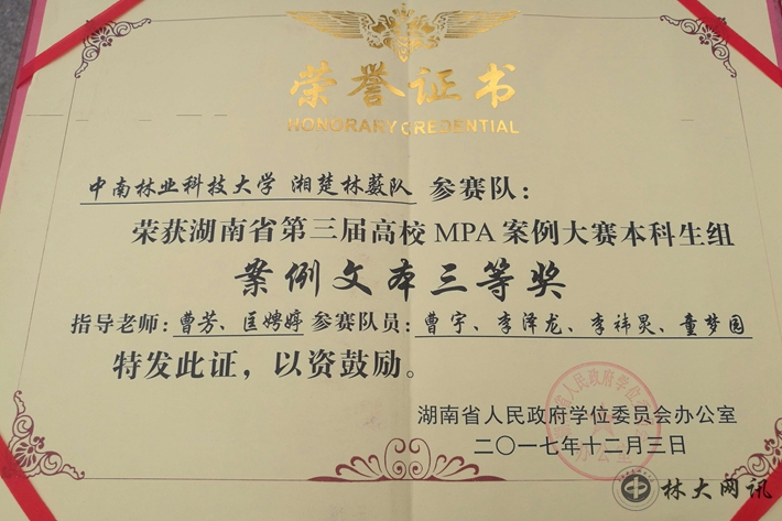 【林大网讯】(文/政法学院 熊玲君)12月3日,由湖南省人民政府学位委员会主办,湘潭大学承办,《中国行政管理》杂志社协办的湖南省第三届高校MPA案例大赛在湘潭大学落幕。全省共有13所高校的55支队伍参赛,分为本科生组和研究生组,设一等奖2项,二等奖4项,三等奖6项。我校政法学院2016级行政管理本科生李祎炅、童梦园、李泽龙、曹宇四位同学组队,在曹芳、匡娉婷老师的指导下撰写的《信用租房:无“信”不立时代租房模式的新变革》荣获本科生组三等奖。