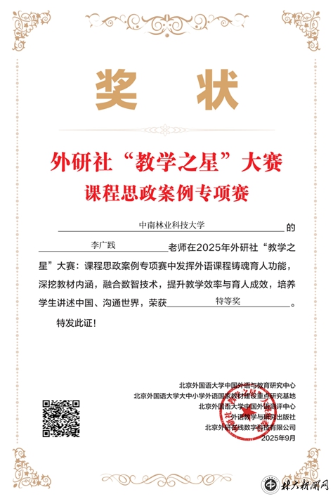 【林大网讯】(文/外国语学院)近日,2025年外研社“教学之星”大赛课程思政案例专项赛获奖名单公布,我校外国语学院李广践副教授荣获特等奖。