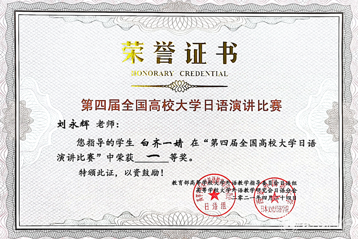 大三时,学校有二外日语课,她十分激动,终于可以系统学习了。她说刘永辉老师上课十分幽默,教学方式丰富灵活,因此在课上十分努力。通过一段时间学习,刘永辉老师发现,白齐一婧不但发音很好,而且学习进度快,接受能力很强,推荐她参加全国高校大学日语演讲比赛。备赛的过程枯燥冗长,寒假期间,她和老师不断打磨初稿,纠正自己的发音和语调,并找之前参赛过的同学学习经验,坚持每天写各种题材的演讲稿,抓住一切机会在人前演讲,比赛前几天每天坚持和老师,在线上进行模拟训练,终于斩获佳绩。