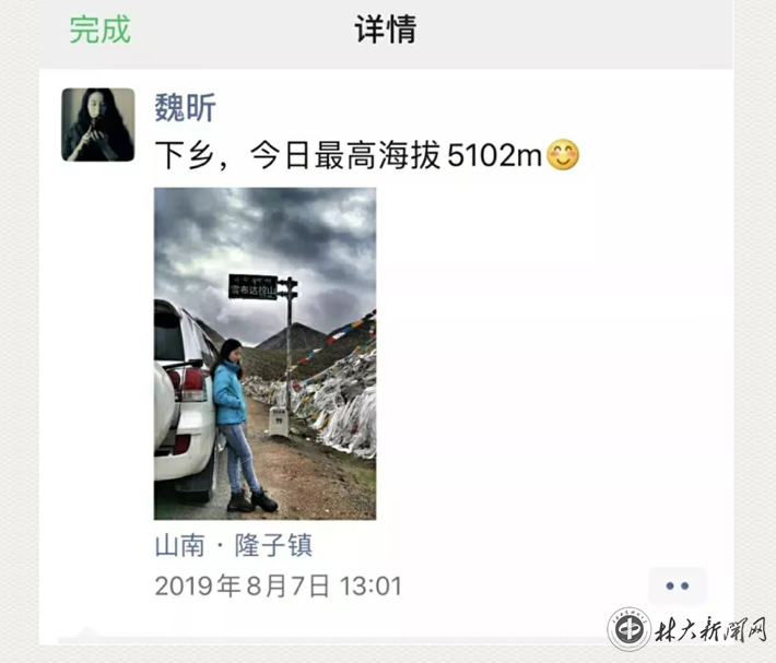 她还利用自己新媒体运营的经验,主动义务承担援藏队的宣传工作,作为援藏队官方公众号“湘遇山南”的主编,以每天两篇推文的效率更新,向各界传播援藏工作队的声音。进藏四个多月以来,她无惧不适应、高反等辛苦和危险,拍照、摄影、写作、组稿、编辑,累计发送推文百余篇,阅读量几十万人次,并多次被新湖南、红网等媒体转载,为湖南援藏湘军、援藏铁军形象的打造做出了贡献。她靠自己的才华和拼搏,被援藏队领导同事誉为援藏队“女一号”“魏大师”。