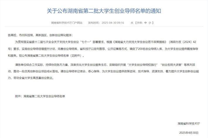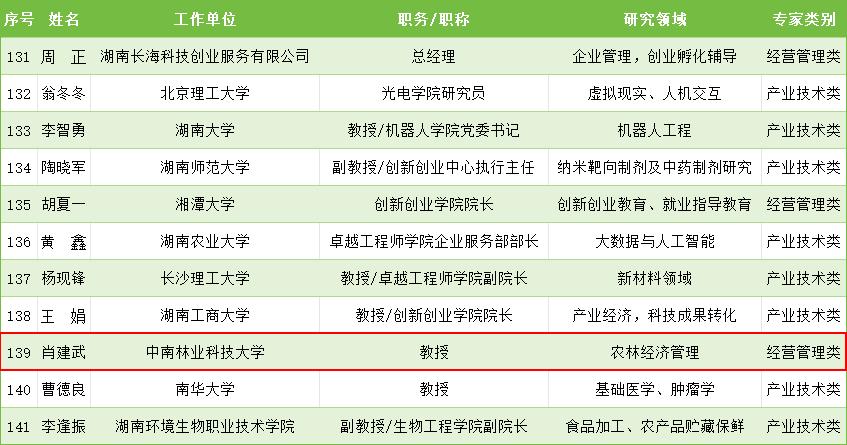 【林大网讯】(文/经济管理学院)近日,省科技厅公布了湖南省第二批大学生创业导师名单。根据《湖南省大力支持大学生创业若干政策措施》要求,省科技厅以定向推荐、公开征集等方式,确定了200名创业导师入库,为大学生创业提供精准指导和服务。我校经济管理学院肖建武教授成功入选。