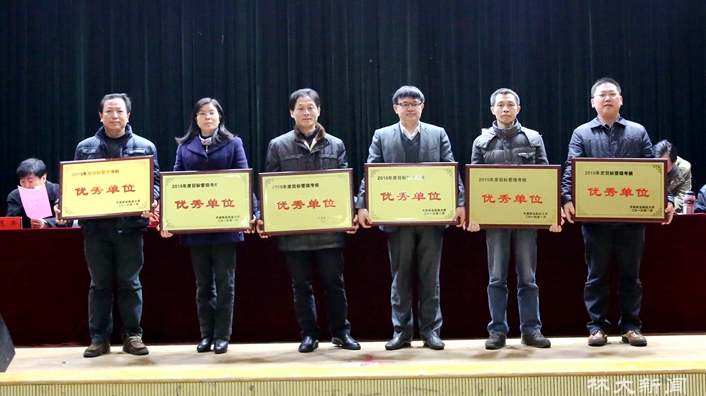 周先雁强调,目标管理历经6年的摸索和发展,已成为促进我校发展的一个重要手段和措施。为更加科学发挥目标管理的重要作用,下一步我们仍将继续征求意见并进行修订完善。下学期开学后将签订《2016年目标管理责任书》,请各部门、单位尽早谋划,结合学校十三五规划、围绕中心工作认真研究年度目标任务,推动学校事业发展更上新台阶。并在大会上对我校各单位考核结果进行了通报表彰,共评选出6个优秀单位、12个良好单位、5个单项奖,没有不合格单位。