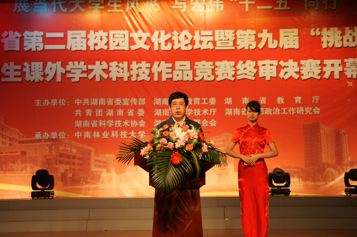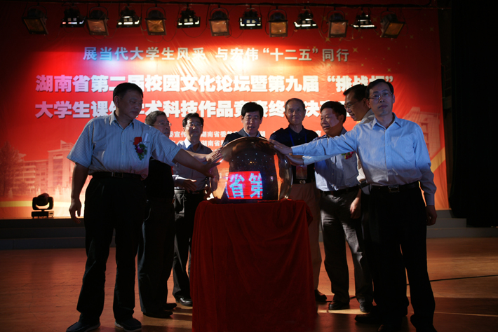 5月7日,由省委宣传部、省委教育工委、省教育厅、团省委、省科技厅、省政研会、省科协、省学联联合主办的湖南省第二届校园文化论坛暨第九届“挑战杯”大学生课外学术科技作品竞赛终审决赛在我校举行。副省长韩永文、教育部社会科学司原司长、全国“挑战杯”评委会常务副主任奚广庆、省政府副秘书长石华清、省委宣传部副部长张志初、共青团湖南省委副书记陈雪楚、省科技厅总工程师姜郁文、省科协副主席廖任强、我校党委书记章怀云、校长周先雁出席开幕式,来自全省各市(州)委宣传部长,48所高校校领导、团委书记及学生代表共计近千人参加。开幕式由省教育厅党组成员、省教育工委专职委员夏智伦主持。