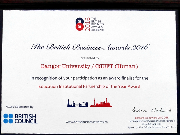 英国驻华大使吴百纳女士(Barbara Woodward CMG OBE)出席了颁奖仪式,她评价班戈学院说:“我很高兴地看到班戈学院在促进英国和湖南的双边交流中发挥了非常积极的作用。”“更让人高兴的是,自去年开始,班戈学院林学专业正式招生,彰显出班戈大学与中南林业科技大学在各自国内环境保护领域所扮演的重要角色。该项目也将为英中两国共同应对全球气候变化,提供持续的智力支持。”